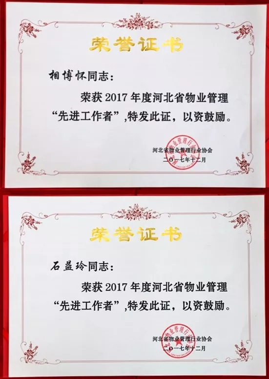 总裁相博怀先生、副总经理石益玲女士荣获《2017年度河北省物业管理先进工作者》称号