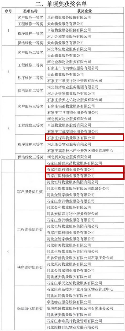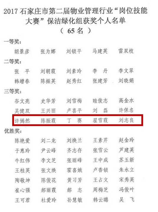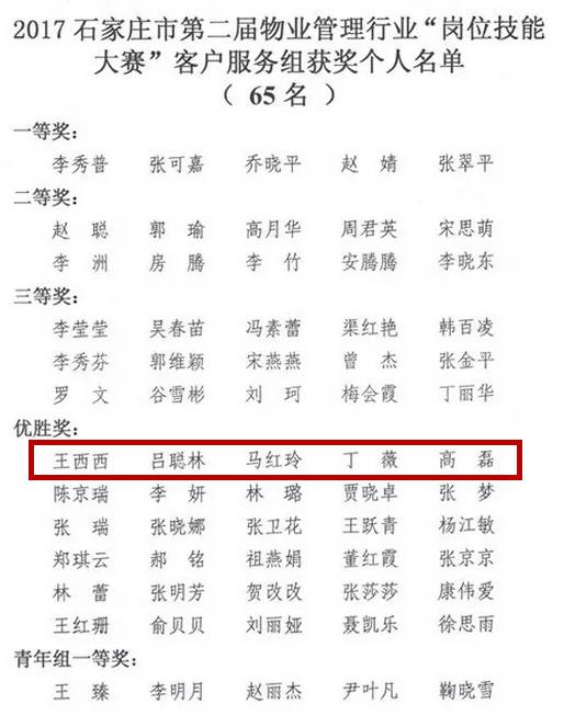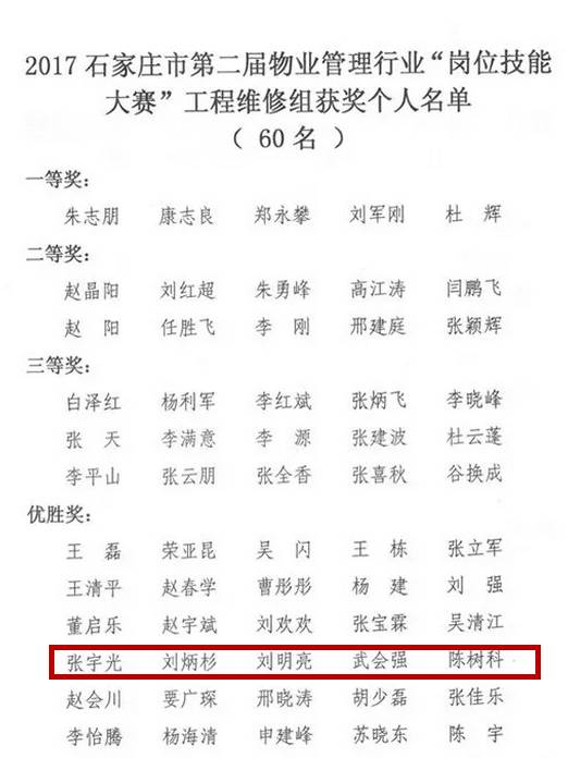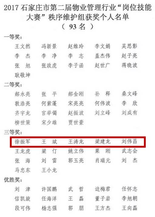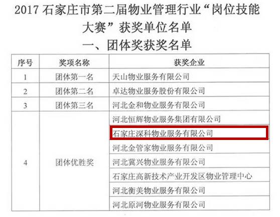 近日,由石家庄市住房和城乡建设局下发了石住建办【2017】367号文《关于表彰石家庄市第二届物业管理行业“岗位技能大赛”获奖单位和个人的通知》,此次竞赛,各县(市)区物业主管部门选拔44支物业企业代表队和石家庄学院代表队共45支参赛队伍参赛,参赛队员共861名。通过竞赛,决出团体一、二、三等奖个1名,团体优胜奖7名;单项一等奖1名,二等奖2名,三等奖3名,单项优胜奖各6名;各类荣誉奖项6名,获奖先进个人共283名。